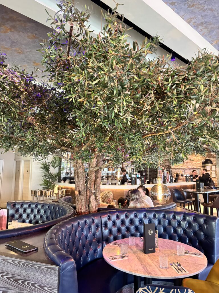 We were greeted and shown to our table- a comfortable booth adjacent to the open kitchen and handed menus by our server Paola, who took good care of us throughout our visit.  It was difficult not to notice the stunning olive tree decorated with lights in the centre of the restaurant, acting as the main focal point and put into perspective just how large this place really is.